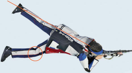 Варианты положения правой ноги: Выпрямленная правая нога в изготовке для стрельбы лежа усиливает контакт тела с полом. Правая нога, согнутая в колене, способствует перераспределению массы на левую сторону тела. В таком положении уменьшается влияние абдоминального пульса на систему «стрелок–оружие» и усиливается контакт между плечом и оружием.
