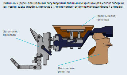 Затыльник (здесь специальный регулируемый затыльник с крючком для малокалиберной винтовки), щека (гребень) приклада и «пистолетная» рукоятка малокалиберной винтовки.