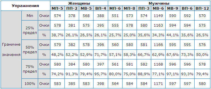 Кроме того, обязательно учитывается степень соответствия реальных результатов каждого спортсмена. Таблицы контрольных нормативов, также разработанным комплексной научной группой. Эта таблица основана на статистической оценке спортивных результатов стрелков, показанных в упражнениях олимпийской программы на крупнейших 55 соревнованиях в мире и Европе, проводившихся Международной Федерацией стрельбы (ISFF) и Европейской конфедерацией (ESC) за последние олимпийские циклы.