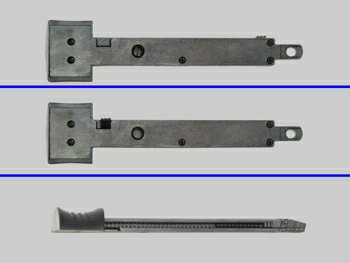В принципе, все шаги, кроме третьего, очевидные и типовые для многих похожих пистолетов со свободным затвором. А вот "шаманское" действие в третьем пункте объясняется оригинальной методикой фиксирования (и смягчения отката) затвора. |  |  | | Фото 16. Снятие затвора. | Фото 17. Два положения буфера. | Если сравнить положения затвора на фото 16, где он уже снимается, и на фото 6, где он просто отведён в заднее положение, видно, что разница по сдвигу затвора составляет всего 3-5мм. Но этого уже достаточно для снятия затвора. А на фото 17 видна причина этой разницы - небольшая металлическая деталька-буфер с пружинками, которая принимает на себя откат затвора в самом его крайнем положении и не даёт ему случайно сняться в процессе стрельбы. На верхней части фотографии она находится в "рабочем" положении, т.е. так, как её подпирает скобка, снятая при разборке. На нижней же половине фотографии она находится в свободном положении, позволяющем снять затвор. И вот именно чтобы опустить эту деталь надо немного потрясти пистолет после снятия скобки. На фото 18, кстати, хорошо виден выступ в середине снятой скобки, которым она и подпирает эту деталь в собранном пистолете. |  |  | | Фото 18. Со снятым затвором, вид сбоку. | Фото 19. Со снятым затвором, вид сверху. | Сам "газовый двигатель" оригинальностью не отличается - вполне обычная конструкция со щелями в клапане и цилиндром на затворе. Единственное, что порадовало - затвор, при желании можно с цилиндра снять и поставить другой. Т.е. подтверждается идея о возможности "натянуть шкуру" любого пистолета близкого габарита путём замены рукояти и затвора. Да, непростое дело, но всё же вполне реальное. А на последней фото 21 хорошо видна причина выкатывания шариков из ствола при плавном нажатии на спуск не до конца. Ибо видно, что при нажатии на спуск (нижняя часть фото) в обойму входит трубочка-отсекатель, которая позволяет более экономно расходовать газ (не тратя его на отбрасывание оставшихся шариков в магазине), но она же и является причиной выкатывания шарика, если выстрела так и не произошло.  Фото 20. Собственно снятый затвор. Фото 21. Клапанная группа при свободном и нажатом спуске