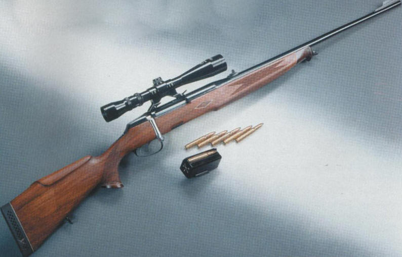 Роторный магазин гарантирует четкую подачу патронов в патронник при различных скоростях досылания, что является определяющим фактором безопасности при охоте на агрессивных крупных зверей. Этот магазин емкостью 5 патронов хорошо сочетается с классическим обликом карабина и создает широкое поле деятельности граверам и резчикам при художественной отделке.