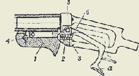 Рис. 24. Типичная и наиболее распространенная конструкция затвора современного дробового ружья: А - детали затвора: 1 - верхний ключ (а - поводок поперечного болта); 2 - ось затвора (мотыль); 3 - рамка (засов); 4 - поперечный болт; 5 - пружина затвора (б - пружина, в - колпачок); Б - взаимное расположение деталей затвора.