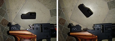 При каждом выстреле стальная втулка на долю секунды въезжает в камору барабана (см. рис. слева), полностью устраняя люфт. Итак повторюсь, в комплектацию входит: пистолет, кейс, паспорт, отстрел, резервуар с манометром, прокладка для холостого щелчка, отвертки-шестигранники, деревянная ортопедическая рукоятка, переходник для заправки резервуара, вкладыш для многозарядной стрельбы на 8 выстрелов. ЭКСПЛУАТАЦИЯПри транспортировке и хранении между пистолетом и резервуаром для воздуха вставляется красная резиновая шайба. Это позволяет снять давление с редуктора и является защитой от случайного выстрела. Перед стрельбой из Рохма необходимо: Пистолет оснащен предохранителем, который одновременно является фиксатором клипа.