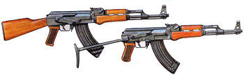 Советский автомат АК-47 системы Калашникова образца 1947г. Длина без штыка - 870мм, калибр - 7,62мм, масса без штыка и патронов — 3,8кг, скорострельность — 40 выстрелов в минуту одиночным огнем, 100 — очередями, прицельная дальность стрельбы — 800м, емкость магазина — 30 патронов. АК со складным прикладом. Длина — 880 — 645мм.