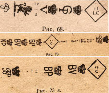Калибр ствола, если поперечник его не более наименьшего размера, принятого в Англии для папковых гильз, напр., для 12 калибра - 18,52 мм, отмечается одной соответствующей цифрой (12, 16 и т.д.), если же поперечник фактически больше нормального размера, ставится клеймо а виде дроби, напр., 12/1 — для 12 калибра, 16/1-16 кал. и т.д., что означает переход к высшему калибру (напр., 12/1 переход от 12 кал. к 11, 16/1 — от 16 к. — к 15 и т.д.). При наличии поперечника меньшего по сравнению с наименьшим размером, принятым в Англии для того или иного калибра, числителем ставится цифра, означающая следующий низший калибр, напр., 13/1 означает калибр переходной от 13 к 12-му. B итоге нормальный набор клейм для ружья лондонского происхождения получает форму, изображенную на рис. 66. Клеймо это, вернее сумма клейм, буквально обозначает: ружье выдержало первое и второе испытания, патронники под гильзу 12 калибра, калибр ствола по его фактическому поперечнику является переходом от 12 калибра к 11, сверловка чок.