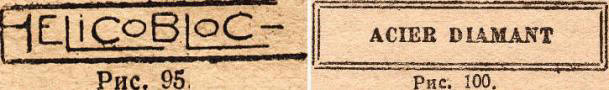 Гелистоп («Helistop») и «Гелидуплекс» («Heliduplex»). Наличие этих специальных нижнего и верхнего скреплений фирма отмечает на стволах клеймом, изображенным на рисунке 95 с соответствующей надписью, и надписями на головке затворного ключа (рис. 96 и 97). На подушке стволов имеется фабричная марка, как на рисунке 98 или же в форме монограммы из букв F, V и с (Fabrique Verney-Carron), приведенной на рис. 99. Стволы для своих ружей Bepнeй-Каррон изготовляет из своей стали, причем для более высоких сортов — из стали «алмазной» («Acier Diamante»), клеймо, которое изображено на рисунке 100; для ружей же среднего достоинства — из прессованной стали (Acier Comprime).