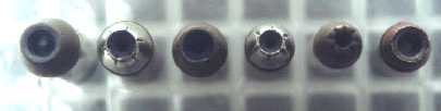 Посмотрите на фотографии, где четко видно - диаметры некоторых патронов совпадают: слева на право - 45АКП, 10мм Ауто, 40СВ, 9мм Штайр, 9мм Парабеллум, 9мм Макаров. Все пули - JHP - с экспансивной выемкой (разворачивающиеся), даже Макаров. Обратите внимание, что на данной фотографии гильза 9мм Макаров сделана из обыкновенной стали, гильзы 9мм Парабеллум и 45АКП из нержавеющей стали, а остальные гильзы латунные.