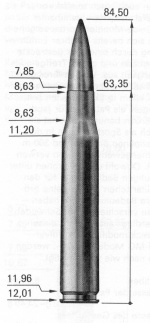 ТТХ патрона: номинальный калибр: 7.62мм диаметр пули: 7,9мм Масса пули: 9,6-13 г Масса пороха: 3,1г V0: 780-870 м/с Е0: 2920-4466 Дж