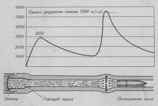 Нужно отметить, что характер нарастания давления пороховых газов в канале ствола в значительной мере зависит от плотности порохового заряда: с ее увеличением резко растет скорость горения пороха, а следовательно, и давление газов (вплоть до возникновения детонации). Поэтому во избежание несчастных случаев не следует стрелять патронами с глубоко посаженными пулями. Как известно, с увеличением влажности порох горит медленнее, отчего и давление пороховых газов в канале ствола нарастает медленнее. При отсыревшем пороховом заряде возможен затяжной выстрел, при котором между ударом бойка по капсюлю и появлением звука выстрела проходит заметный промежуток времени. Если влажность заряда повышенная да еще мощность капсюля недостаточна, луч пламени от взрыва ударного состава не может одновременно зажечь все пороховые зерна - он воспламеняет лишь близлежащие слои пороха, и от них уже через некоторый промежуток времени загораются следующие. Если после спуска курка выстрела не последовало, не нужно торопиться перезаряжать оружие, следует выждать некоторое время, чтобы не произошло взрыва порохового заряда при открытом затворе. Нужна особая осторожность, если патроны длительное время хранились без герметической упаковки и в недостаточно сухом месте. При горении заряда пороховые газы в стволе оружия развивают, как мы уже говорили, очень высокое давление. Даже наименьшее давление в дульной части ствола в момент вылета пули равно нескольким сотням атмосфер (одна техническая атмосфера равна давлению 1 кг на 1 см2 площади). Естественно, чтобы выдерживать такое напряжение, ствол оружия должен иметь большую прочность. Зависит она от толщины стенок ствола и качества металла. В соответствии с характером кривой давления газов ствол огнестрельного оружия в казенной части делается толще, а в дульной тоньше. Толщина стенок его рассчитывается с таким запасом прочности, чтобы они выдерживали давление пороховых газов значительно больше нормального, на несколько сотен и даже тысяч атмосфер. Так, для стандартной винтовки АВ, максимальное давление в канале ствола которой достигает 2850-3200 атм, дополнительный запас прочности составляет 2650-2300 атм. Это значит, что ствол ее в отдельных случаях может выдержать громадное давление - до 5500 атм. При выстреле стенки ствола, сопротивляясь давлению газов, расширяются. Поэтому прочность его рассчитывается так, чтобы металл подвергался только упругим деформациям расширения: под давлением расширялся, а по прекращении его принимал первоначальные размеры. Если же давление в стволе превысит расчетную величину (в данном случае 5500 атм), то наступит остаточная деформация и ствол окажется раздут (рис. 28) или даже разорван.  Рис. 28 - Схема раздутия канала ствола, которое образуется при давлении пороховых газов, превышающем запас прочности ствола