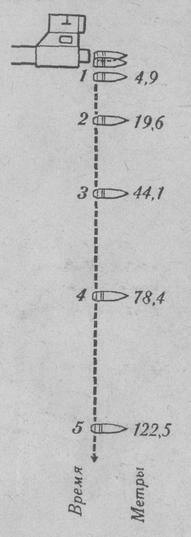 Движение пули, а следовательно, и форма траектории зависят от многих условий. Поэтому необходимо прежде всего рассмотреть, как действуют на пулю в отдельности сила тяжести и сила сопротивления воздушной среды. Действие силы тяжести. Представим, что на пулю, вылетевшую из канала ствола, не действует никакая сила. В таком случае она двигалась бы по инерции бесконечно, равномерно и прямолинейно по направлению оси канала ствола и за каждую секунду пролетала бы одинаковые расстояния с постоянной скоростью, равной начальной. Тогда, если бы ствол оружия был направлен прямо в цель, пуля, следуя в направлении оси канала ствола, непременно попала бы в нее (рис. 36).  Рис. 36 - Движение пули по инерции (если бы не было силы тяжести и сопротивления воздуха)
