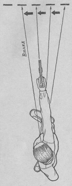 На рис. 272 показаны различные принципиальные схемы отработки первого выстрела в четырехсекундной серии: каждая из приведенных схем имеет свои положительные стороны. Так, вариант I хорош тем, что стрелок располагает относительно большим временем для выравнивания мушки в прорези. Однако быстрая и значительная переброска взгляда вниз может привести к тому, что при последующем подъеме руки и сопровождении взглядом прицельных приспособлений будет потеряно общее ориентирование относительно центра мишени, в связи с чем рука с оружием будет выведена куда-нибудь в сторону от "десятки". При варианте II, когда взгляд направлен не на центр, а на нижнюю часть мишени, приходится меньше переносить его для перехвата прицельных приспособлений. Вариант III характерен тем, что стрелок смотрит рассеянным (неотфокусированным) взором на нижнюю часть мишени; затем, когда прицельные приспособления встретятся со взглядом, по мере подъема руки начинается фокусирование взгляда на прицельные приспособления; при этом уточняется взаиморасположение мушки в прорези. При варианте V стрелок вовсе не перебрасывает взгляда вниз, а встречается им с прицельными приспособлениями на уровне "десятки". В этом случае при наблюдении за спортсменом во время стрельбы кажется, что он медленно поднимает руку и выстрел будет произведен с запозданием. На самом же деле выстрел производится быстро, причем как бы с ходу. Надо сказать, что при таком способе рука с оружием очень точно выводится на "десятку", от чего требуется минимальное время на уточнение прицеливания. Как видно, при этом варианте положительно сказывается свойство зрительного анализатора в отношении корректирования и контроля за выполняемым движением. Здесь имеет место то же, что и при езде на велосипеде, когда в одном случае велосипедист смотрит на переднее колесо и еле-еле сохраняет равновесие, а в другом - смотрит вперед и уверенно едет почти по прямой.  Рис. 272 - Принципиальные схемы обработки первого выстрела при четырехсекундной серии