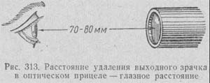 Во время прицеливания стрелку необходимо внимательно следить за тем, чтобы в поле зрения прицела не было затемнений; оно должно быть совершенно чистым. Если глаз стрелка находится ближе или дальше глазного расстояния, то в поле зрения получается круговое затемнение, которое уменьшает его, мешает наблюдению и усложняет прицеливание. Если это затемнение со всех сторон одинаково, то отклонений пуль не будет. Если глаз расположен неправильно относительно главной оптической оси прицела (т.е. смещен в сторону), во время прицеливания на краях окуляра наблюдаются лунообразные тени; они могут быть с любой стороны, в зависимости от положения оси глаза по отношению к оптической оси прицела. При наличии лунообразных теней пули отклоняются в сторону, противоположную им. (рис. 314). Если при прицеливании стрелок заметит тени на краях поля зрения, он должен найти такое положение для головы, при котором глаз ясно видит все поле зрения прицела.Следовательно, чтобы обеспечить точное прицеливание с помощью оптического прицела, стрелку необходимо все внимание направить на удерживание глаза на оптической оси прицела и точное совмещение острия пенька с точкой прицеливания.
