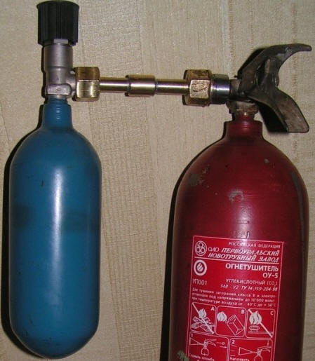 Баллон донор (огнетушитель) комнатной температуры, заправляемый баллон охлажден в лоджии до -17 гр. в результате баллон весом 2.09 кг стал весить 2.80 кг, т.е. в него удалось задуть 0.7 кг СО2, ровно столько сколько требуется.