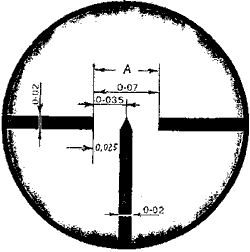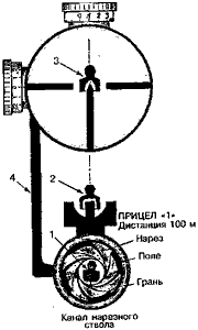 При отклонении линии прицеливания оптического прицела от центра белого круга необходимо вращением барабанчиков совместить ее с центром круга, не изменяя положения наводки по открытому прицелу. После этого шкалу дистанций надо поставить против указателя делением "3", а шкалу боковых поправок - делением "0".