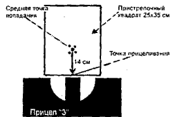 После того как визуально совмещены точки прицеливания открытого и оптического прицелов при одном и том же прицеливании - под обрез прицельного квадрата, пристрелыцик проверяет выполнение вышеописанного тремя боевыми выстрелами, прицеливаясь под обрез прицелочного квадрата оптическим прицелом.