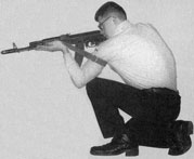 Положение сидя на корточках Это положение еще иногда называют "военным приседом", но меня в юности ему не учили, и в спортивной стрельбе оно тоже практически не применяется.  Положение сидя на корточках не так устойчиво, как обычное положение сидя, но его можно очень быстро принять. Левый локоть - опорный, поэтому желательно пользоваться ремнем. Во всех положениях с упором на левый локоть левое предплечье должно располагаться вертикально, а кисть левой руки должна быть расслаблена.